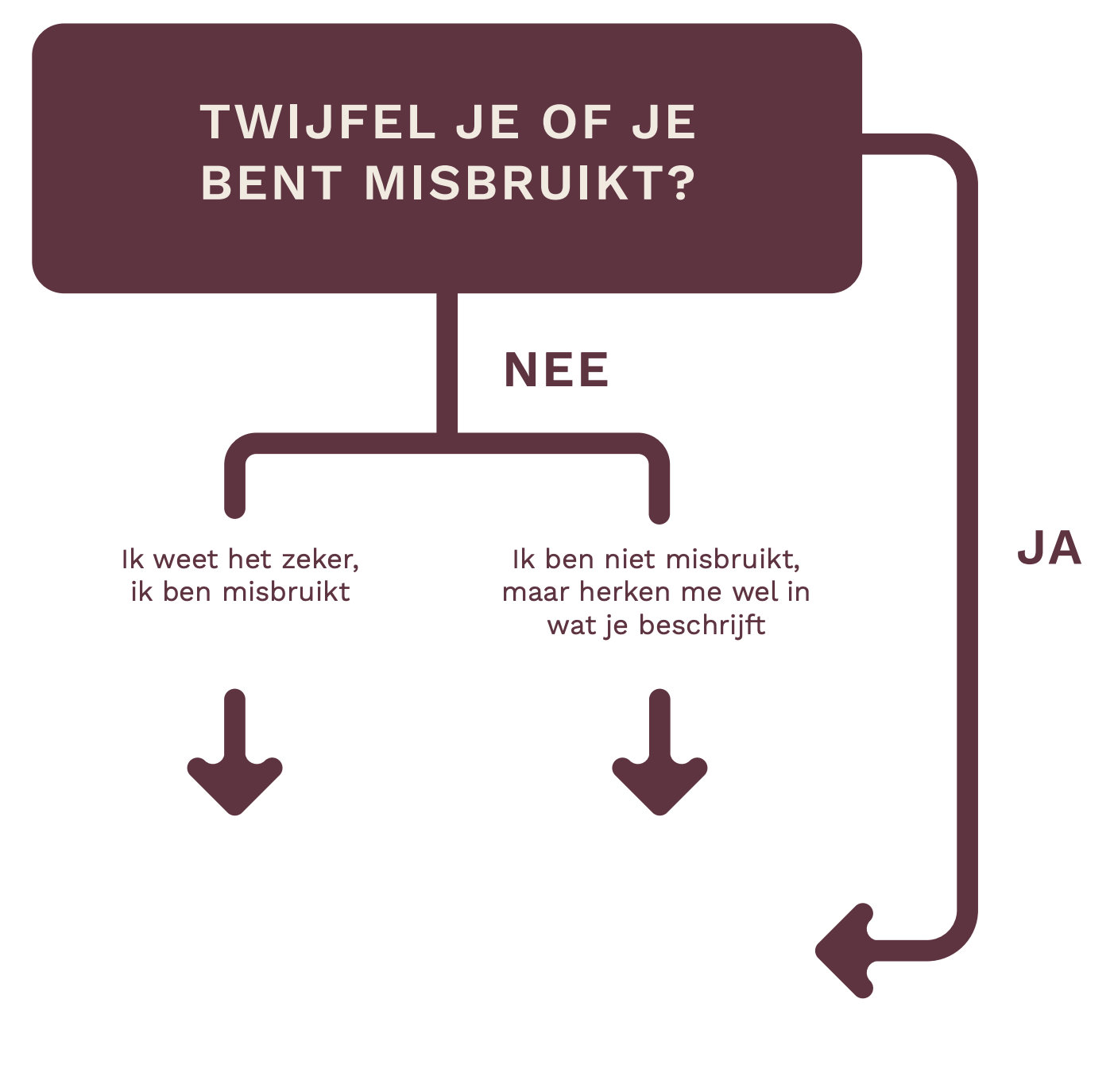 Ook als je twijfelt of je wel seksueel misbruikt bent. Ook als jouw schaamte of schuldgevoel groter is dan jijzelf. Ook als het misbruik ertoe heeft geleid dat je zelf grensoverschrijdend gedrag bent gaan vertonen.